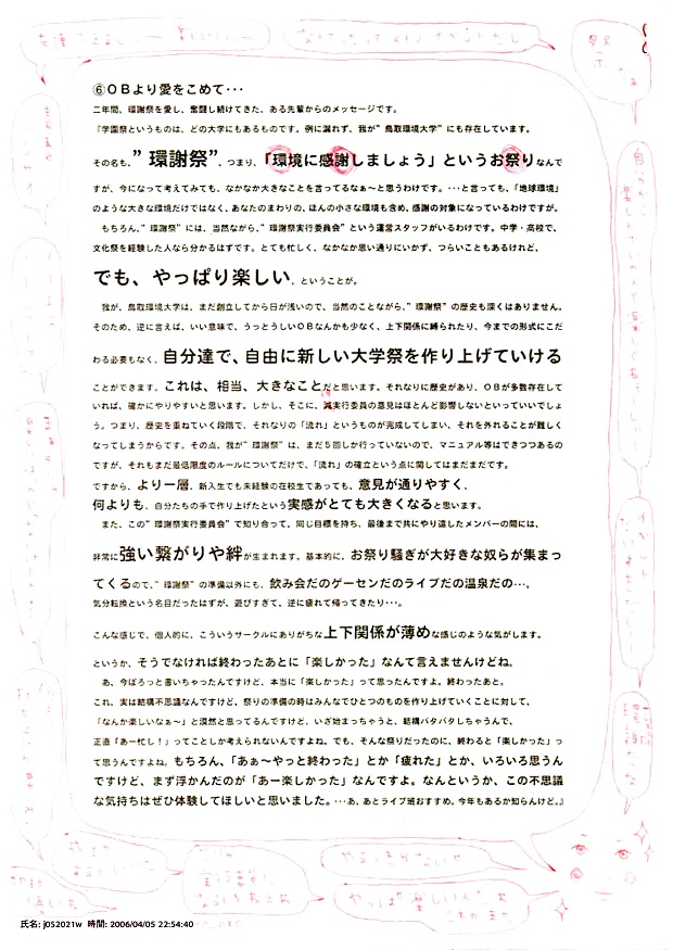 我が、鳥取環境大学は、まだ創立してから日が浅いので、当然のことながら、”環謝祭”の歴史も深くはありません。そのため、逆に言えば、いい意味で、うっとうしいOBなんかも少なく、上下関係に縛られたり、今までの形式にこだわる必要もなく、自分達で、自由に新しい大学祭を作り上げていけることが出来ます。これは、相当、大きなことだと思います。それなりに歴史があり、OBが多数存在していれば、確かにやりやすいと思います。しかし、そこに、現実行委員の意見はほとんど影響しないといっていいでしょう。つまり、歴史を重ねていく段階で、それなりの「流れ」というものが完成してしまい、それを外れることが難しくなってしまうからです。その点、我が”環謝祭”は、まだ5回しか行っていないので、マニュアル等はできつつあるのですが、それもまだ最低限度のルールについてだけで、「流れ」の確立という点に関しては、まだまだです。