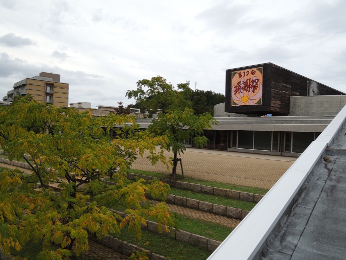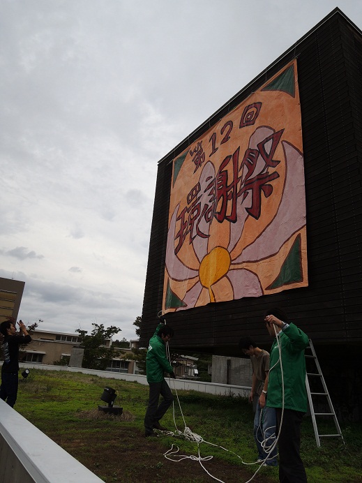 職員の方と一緒に情報メディアセンターの屋上に登り、垂幕を吊るしてきました。
